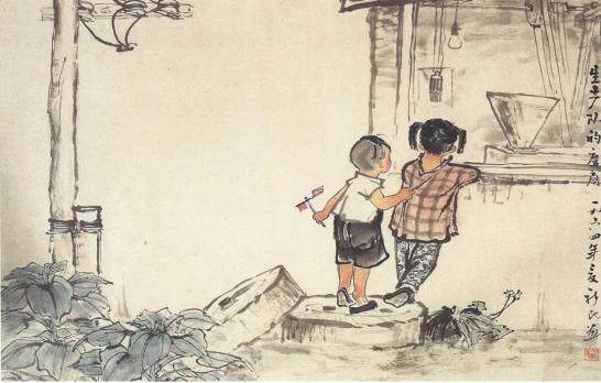画面中齐辛民用简单清晰的笔墨线条勾勒出了当时农村环境下,一对怀着好奇心到磨坊观看新电磨的姐弟形象。50年代末60年代初,当时电力发展到农村,小孩踩到旧磨看新的电磨,用艺术手法侧面表现农村新面貌,至今表现手法依旧很新。尽管我们看不到画中孩子的正脸,也可以通过动态完全感受到新电磨在这两个农村孩子心中所引发的那种关注。