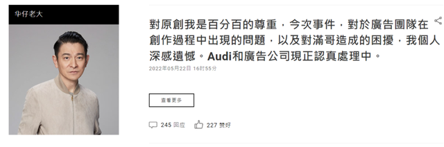 同日下午4点55分,刘德华本人也通过官方后援会APP“华仔天地”发文称:“对原创我是百分百的尊重,今次事件,对于广告团队在创作过程中出现的问题,以及对满哥造成的困扰,我个人深感遗憾。Audi和广告公司现正认真处理中。”
