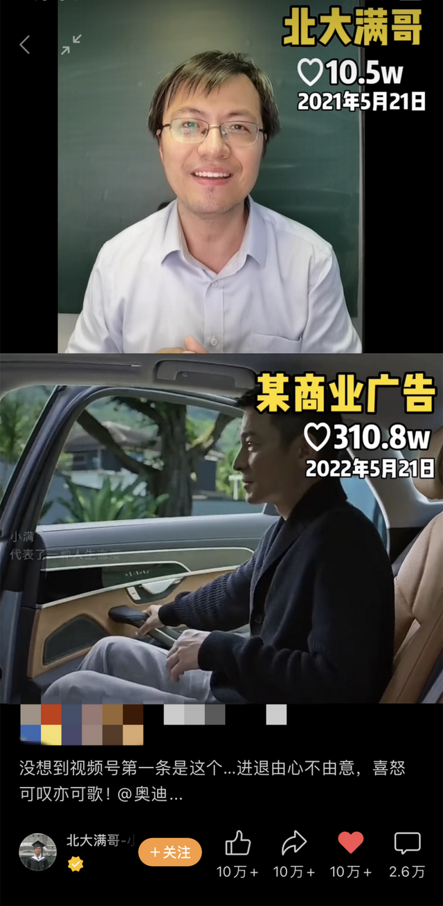 就在广告发布的当日晚间,拥有300多万粉丝的抖音内容创作者“北大满哥”喊话奥迪和刘德华,表示该广告涉嫌抄袭他在2021年5月21日发布的一条视频的文案。