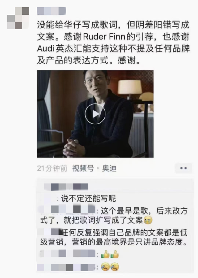 此外,还有网友晒出了疑似此次广告文案作者的朋友圈截图。图中,这位疑似作者表示:“没能给华仔写成歌词,但阴差阳错写成文案。”