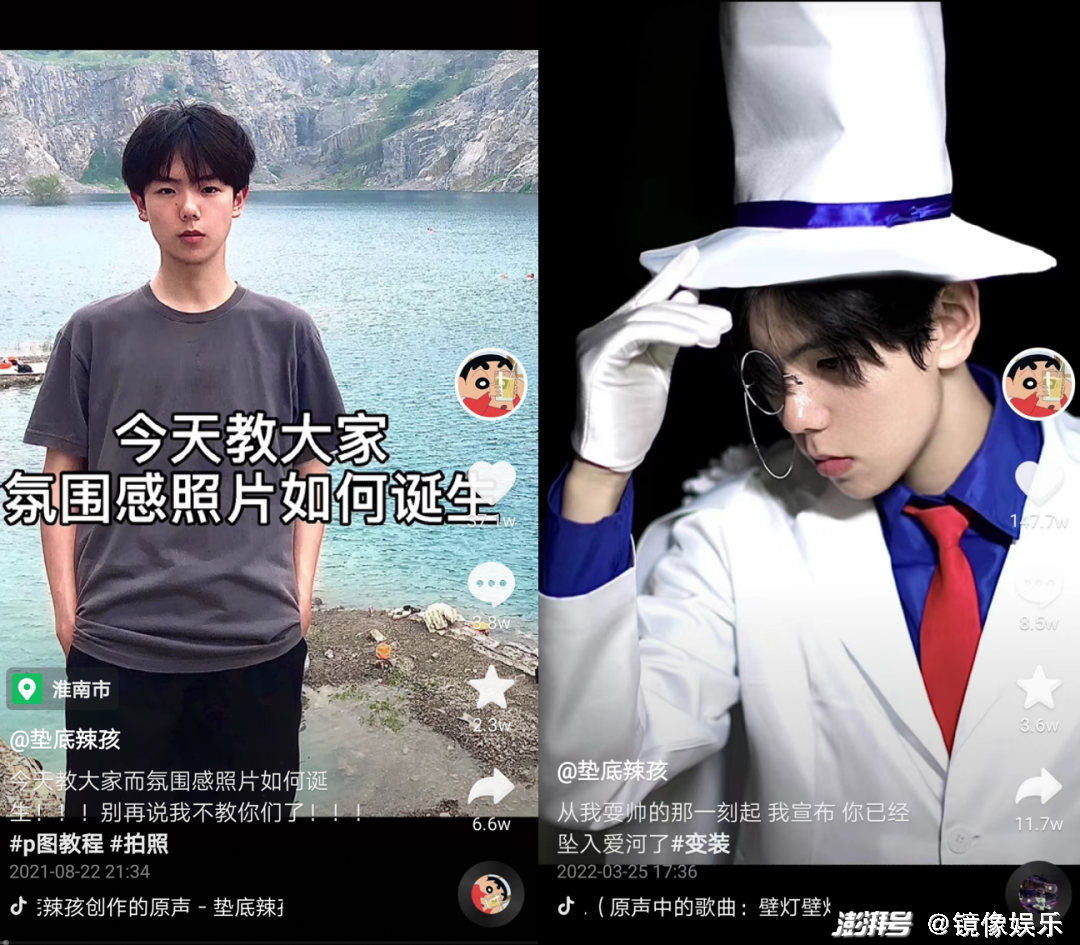 比如在前期,垫底辣孩拍的较多的是“网络男神”系列和“氛围感帅哥”系列,不过,这些内容虽然在短期内形成了固定的模式,但并没有持续拍摄,而是不断穿插其他类型的尝试,比如教大家P图、cosplay怪盗基德等动漫人物、还原小说中的人物形象等,整体的内容风格并不稳定,但核心元素都是变装。