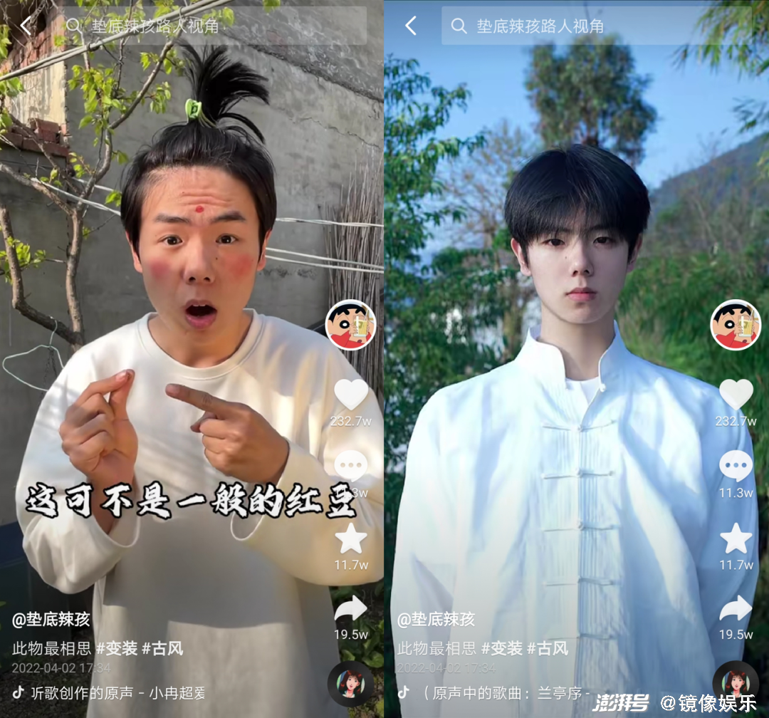基于前期的创作铺垫,4月初“红豆配音”风靡时,垫底辣孩与之结合拍的国风变装迎来一波大高潮,该视频点赞量达到232万,是其第一条点赞量破200万的视频。当时,垫底辣孩已经有意在变装前“扮丑”,拉大变装前后的反差,以至于很多人质疑这是不是同一个人。后来“国际超模”系列,承接起这一波热度,并迅速爆火。