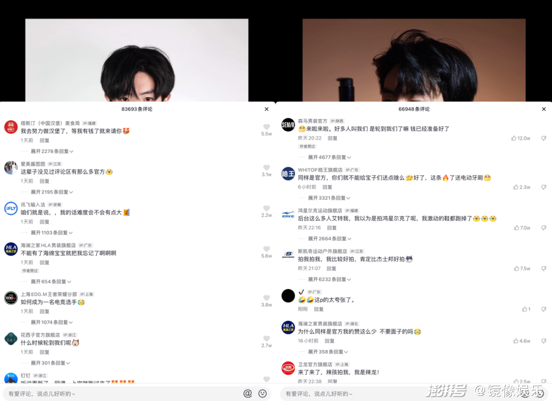 从“品牌代言人”系列第一条视频更新之后,视频高赞评论中便集结了诸多品牌方的身影,特步、回力、Dickies、太平鸟、巴拉巴拉、白象、鸿星尔克、金典、森马、蜜雪冰城……品牌方几乎已将评论区淹没,偶尔挤上来的路人评论也是“这辈子没见过评论区有那么多官方”。最“卷”的时候,鸿星尔克的一条评论发布于凌晨三点。