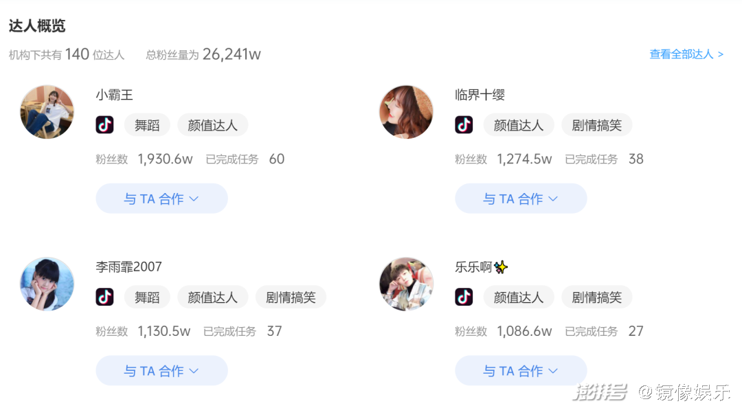 其中,有7位达人的抖音粉丝破千万,包括小霸王、临界十缨、李雨霏2007、乐乐啊等,垫底辣孩大概率会成为公司第8位粉丝过千万的达人。但是,看看世界旗下大多为颜值达人,在其抖音粉丝TOP10的达人中,有7位都有颜值达人的定位。垫底辣孩虽定位美妆,但靠变装走红,本质上也是靠颜值取胜。而公司至今尚未孵化出粉丝量破2000万的达人,大概率也是受制于颜值达人更容易过气的局限性。