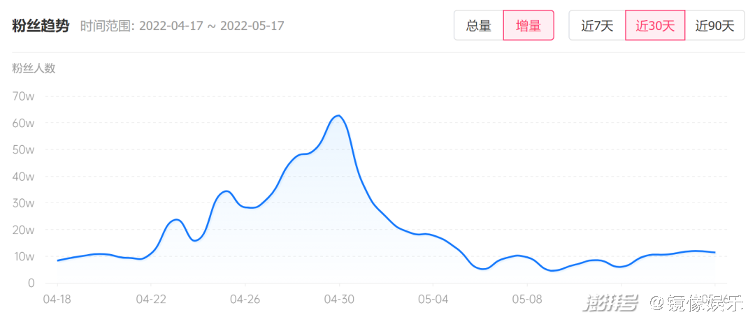 巨量星图数据显示,“国际超模”系列的视频播放量大多都在4000万以上,其中拍摄YSL的那一期播放量最高,达到近8800万次。反映到粉丝增长曲线上,垫底辣孩的粉丝高速增长期出现在4月下旬,也就是“国际超模”系列期间,而增长峰值便出现在“YSL变装”视频之后。