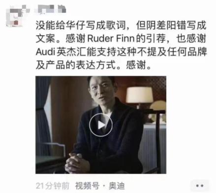 目前,上思或者其外包制作公司负责该广告片的创意总监虽然还未扒出,但文案策划人员似乎已经“自投罗网”。在网传的一位名为“张某某”的微信用户在朋友圈声称,刘德华在奥迪广告片中的文案,是“基于自己歌词进行的改编”。