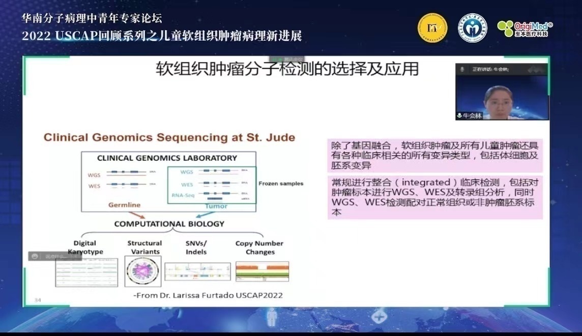 第一环节“真知灼见,粤说粤准”,由特邀讲者广州市妇女儿童医疗中心病理主任医师牛会林分享《儿童软组织肿瘤的分子检测应用》,内容主要是来自于St. Jude儿童研究医院的Dr. Larissa Furtado在分子病理协会-伙伴会议(companion society)的讲座。牛博士首先对目前所应用的分子检测技术-免疫组化染色、荧光原位杂交(FISH)、RT-PCR及二代测序(NGS)进行了概述,然后介绍了儿童软组织肿瘤中的遗传学变异类型,不同肿瘤类型需选择相应的分子检测方法,检测方法选择的考量因素。重点讲述了儿童软组织肿瘤中分子检测方法的选择和应用,首先检测策略需要依据临床病理特征;其次融合基因检测的常用方法是FISH和NGS,并通过举例说明各种分子检测方法在儿童软组织肿瘤应用的优势及局限性。例如:对于儿童CIC重排肉瘤应选择FISH及NGS检测,并强调FISH检查CIC断裂基因的阴性不能排除诊断(假阴性率为14%),ETV4,ETV1,ETV5可以作为CIC重排肉瘤分子标记物。除了基因融合,软组织肿瘤及所有儿童肿瘤还具有各种临床相关的所有变异类型,包括体细胞及胚系变异;常规进行整合(integrated)临床检测,包括对肿瘤标本进行WGS、WES及转录组分析,同时检查配对正常组织或非肿瘤胚系标本,全基因组测序结合肿瘤转录组分析,对于评估DNA变异转录的潜在效应是非常重要的。最后简述了儿童软组织肿瘤分子检测的意义及展望。牛会林博士讲述内容丰富,条理清晰,让与会者感受到了身临USCAP年会现场学习的氛围。