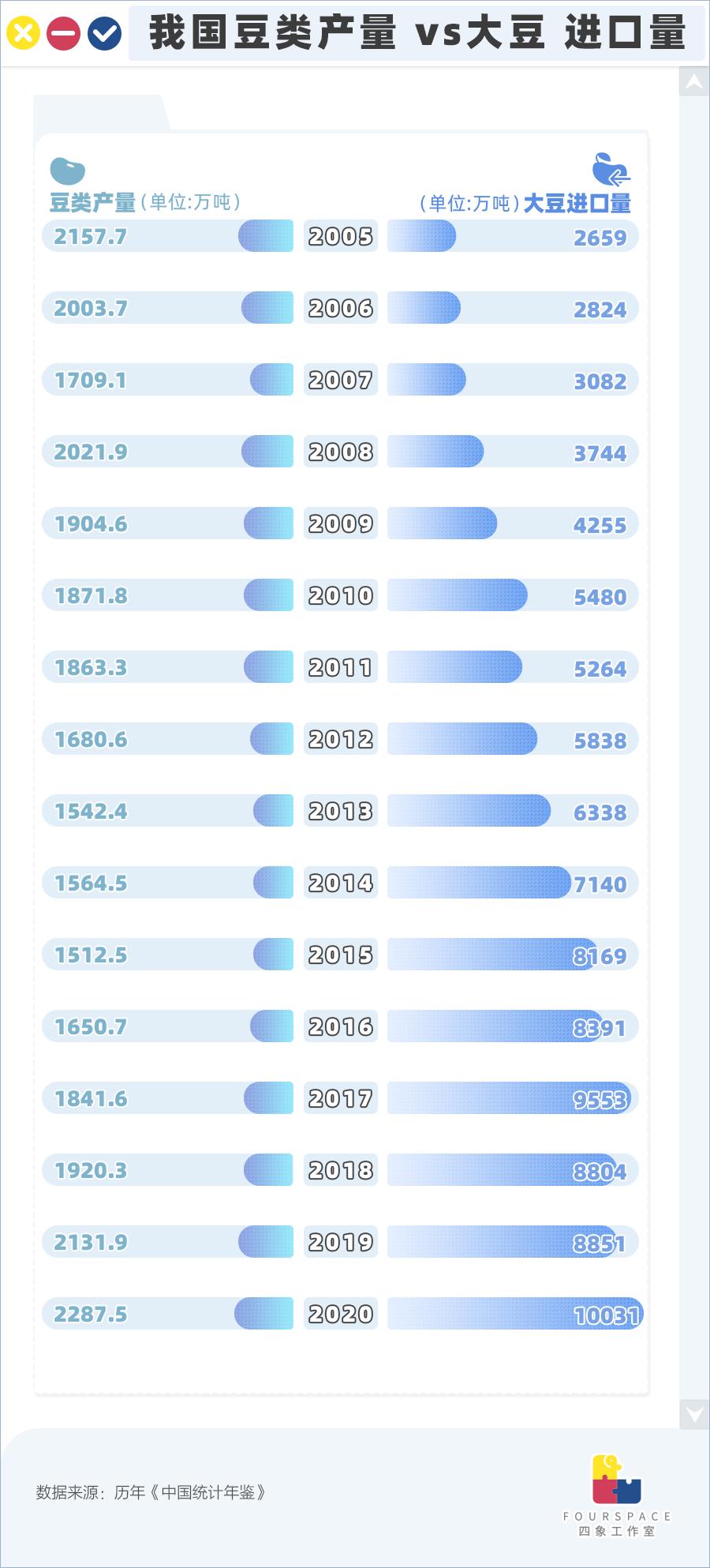 2020年我国进口大豆超过1亿吨,国内产量即使将全部豆类(大豆播种面积约占全部豆类的85%)都算上,进口大豆依然达到了国内全部豆类产量总和的4.4倍。