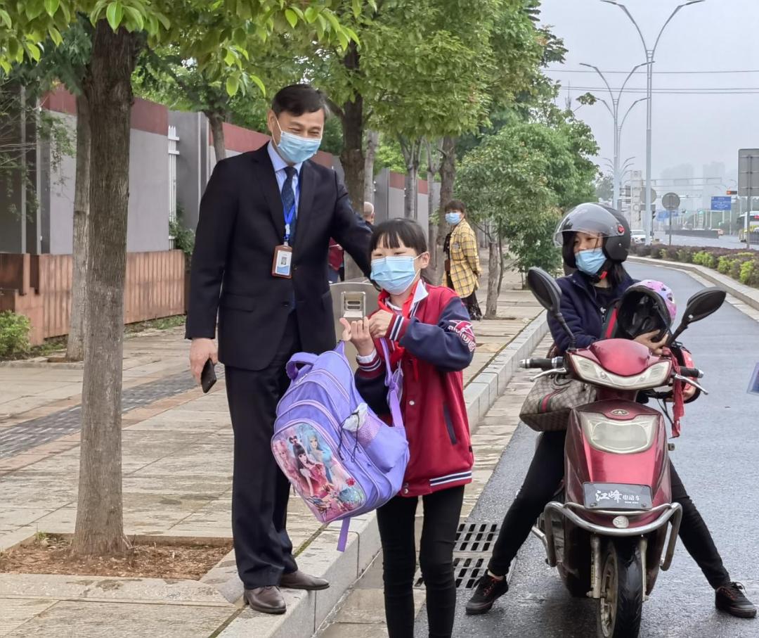 ▲校长罗仁华在校门口迎接返校复学的同学们,并扶乘坐电动车返校同学下车线上学习转校园,上好复学第一课。复学第一课,该校各班班主任细心讲解疫情防控知识,引导同学们从居家线上学习过渡到校园学习,积极调节心理状态,以更饱满的精神状态投入复学后的学习、生活。