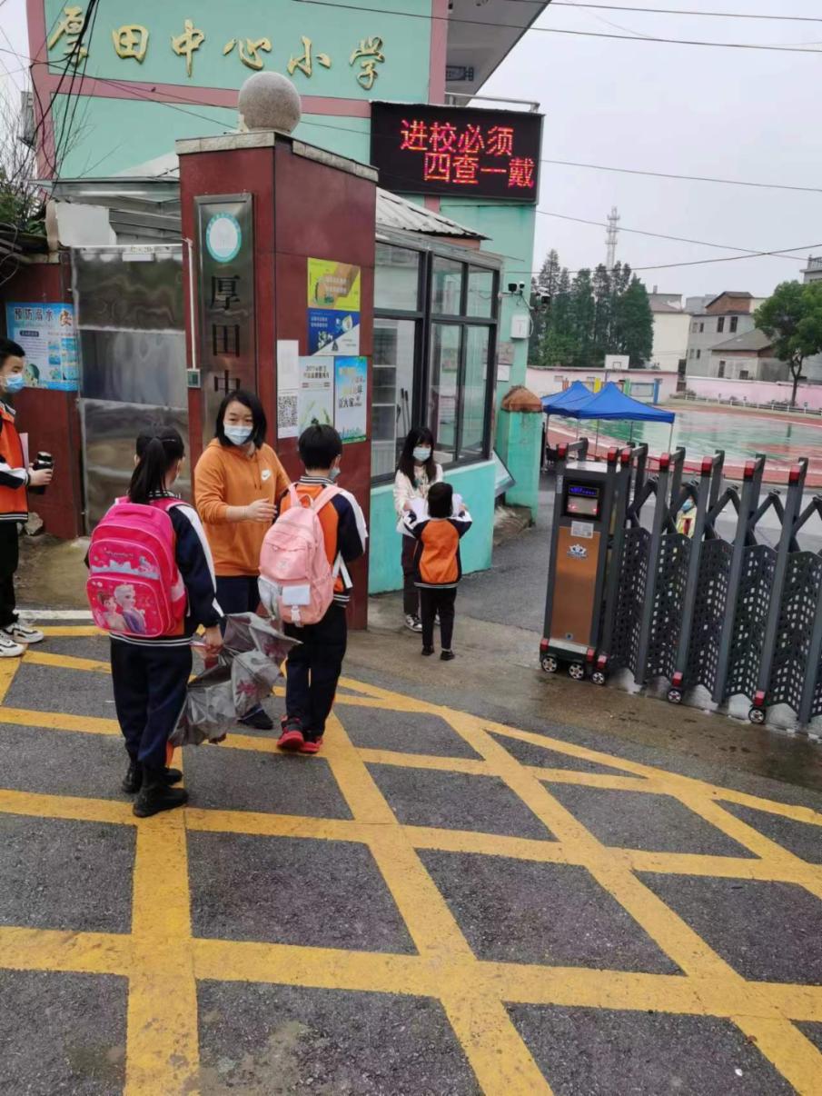 ▲5月23日,厚田中心小学教师们在校门口迎接同学们“连雨不知春去,一晴方觉夏深。”5月23日,厚田中心小学迎来了返校的莘莘学子,该校低、中、高年级分时段入校,同学们佩戴口罩、手持健康信息登记表和健康信息申报卡,在教师的指引下,井然有序完成各项查验和检测等程序进入校园。
