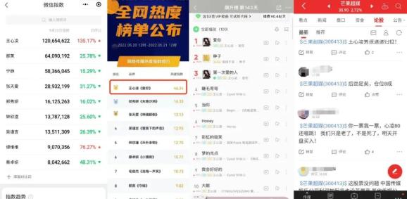在初舞台播出后,节目制作方芒果超媒的股票热度大增。王心凌男粉们看准节目热播带来的关注度,以及芒果超媒目前激增的广告收益,将目光锁定在制作方的股票行情,要“用涨停支持王心凌!”有吧友呼吁:心凌男孩一人十手!用涨停支持王心凌!“你一手,我一手,心凌80还能扭!你一票,我一票,心凌80还能跳!”