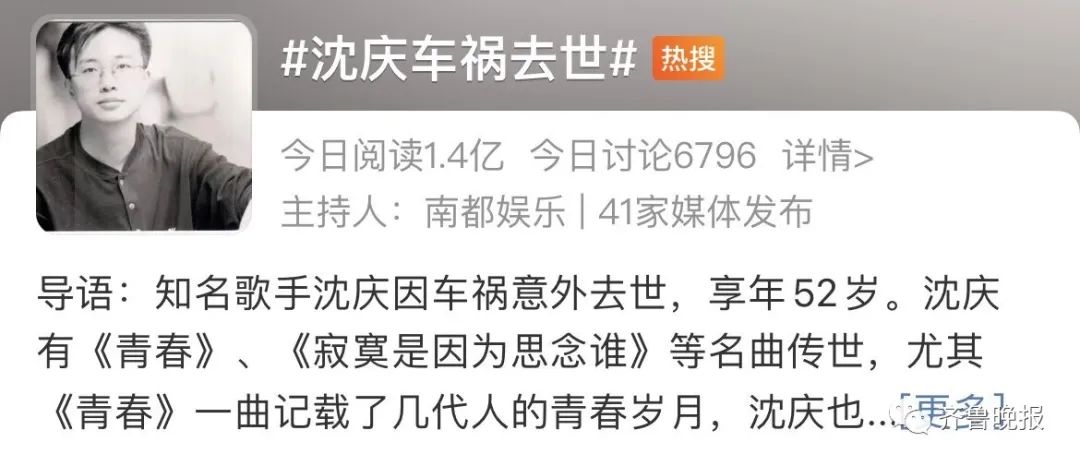 知名歌手沈庆因车祸意外去世的消息,