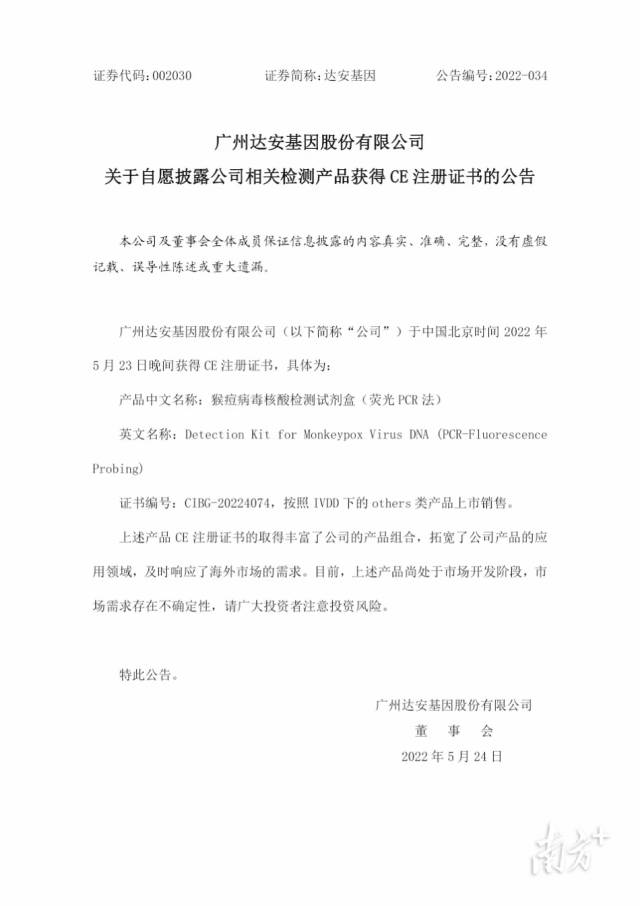 5月24日,广州达安基因股份有限公司(下称“达安基因”)也发布公告称,其研发的产品“猴痘病毒核酸检测试剂盒(荧光PCR法)”已获得CE注册证书。公告披露,上述产品CE注册证书的取得拓宽了公司产品的应用领域,及时响应海外市场的需求。