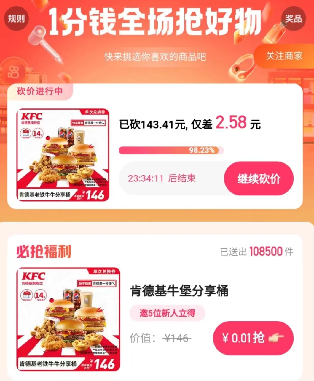 对于用户来说,2022年Q1期间,他们在快手上和好友互动最频繁的应该是“互相助力1分钱吃肯德基”,在快手选择商品、发起砍价、邀请好友助力,规定时间内完成即可1分钱拿到肯德基套餐。