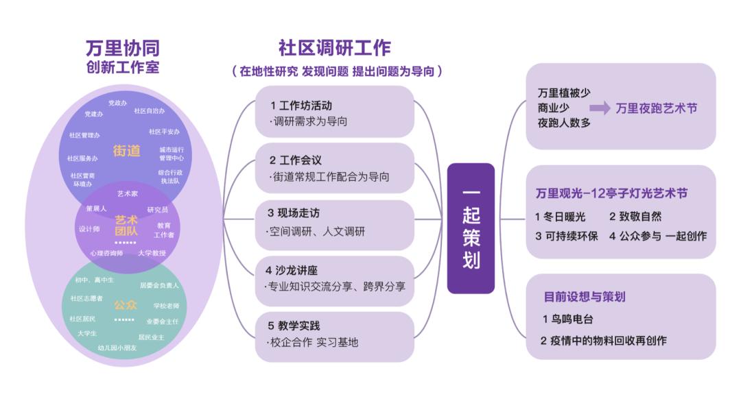 今天我用一个自己实践的案例来分享,2021年初我为万里街道策划了“万里协同创新工作室”,工作室由街道办、公众代表、艺术团队三个参与人员结构组成,邀请与社区相关的各类身份背景的参与者来一起协同创新。带着研究和实践,我们做了一些社区的调研工作:现场走访、空间调研、人文调研,同时还开展沙龙讲座、跨界分享、教学实践。调研期间,我作为工作室主理人为“协同创新工作室”里的各参与者做了系列工作坊,目的是以发现问题,提出解决问题设想的调研为导向:1)唤醒在我们心中对于万里这个大家庭的感知;2)寻找出万里社区独有的特点与价值;3)探寻万里社区从最初到现在的变化“在地性”信息;4)展望万里社区的未来,期待万里的更多提升;5)探讨“万里IP”CIS(MI、BI、VI)。