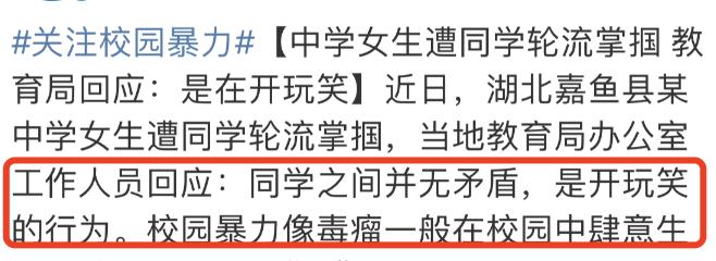 媒体采访时,当地教育局一位工作人员回应:“被打女孩没有受伤。”