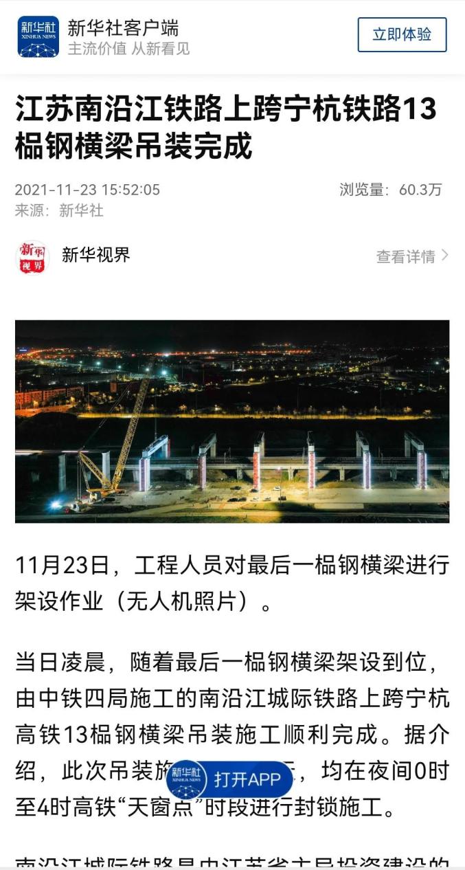 △新华社客户端:江苏南沿江铁路上跨宁杭铁路13榀钢横梁吊装完成印尼雅万高铁万隆区间段箱梁架设全部完成的消息被央视新闻客户端、中国新闻网客户端、《人民日报》客户端、新华网客户端等多家主流媒体相继报道。