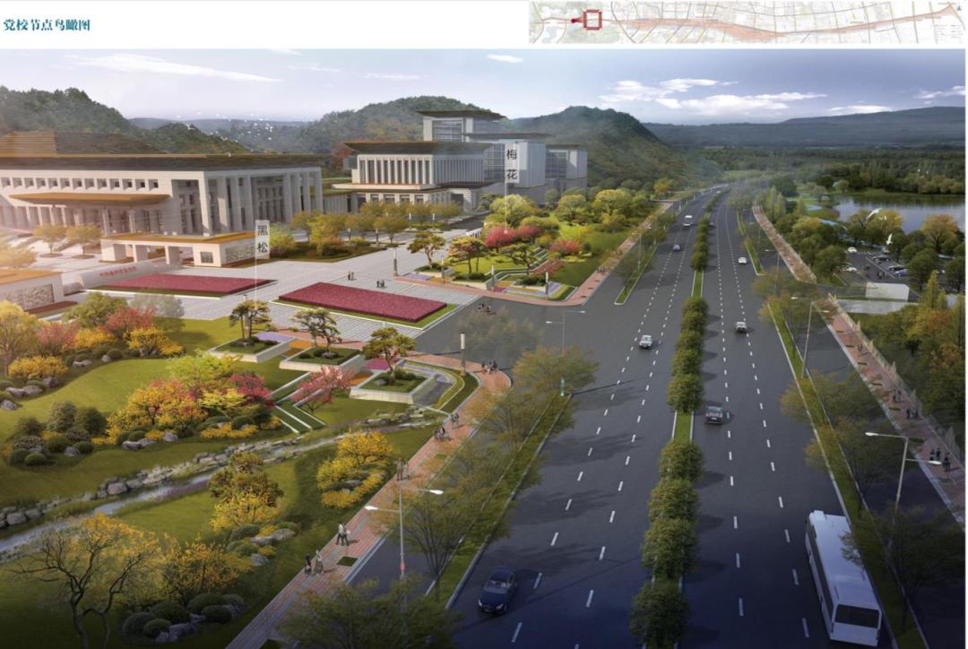 该节点位于党校区块,植物设计以“黑松、红梅、景石”为主基调,通过精致的地形造坡和景石搭配,形成极简、精细的植物设计风格。通过精细化的植物造景体现党校的厚重感。