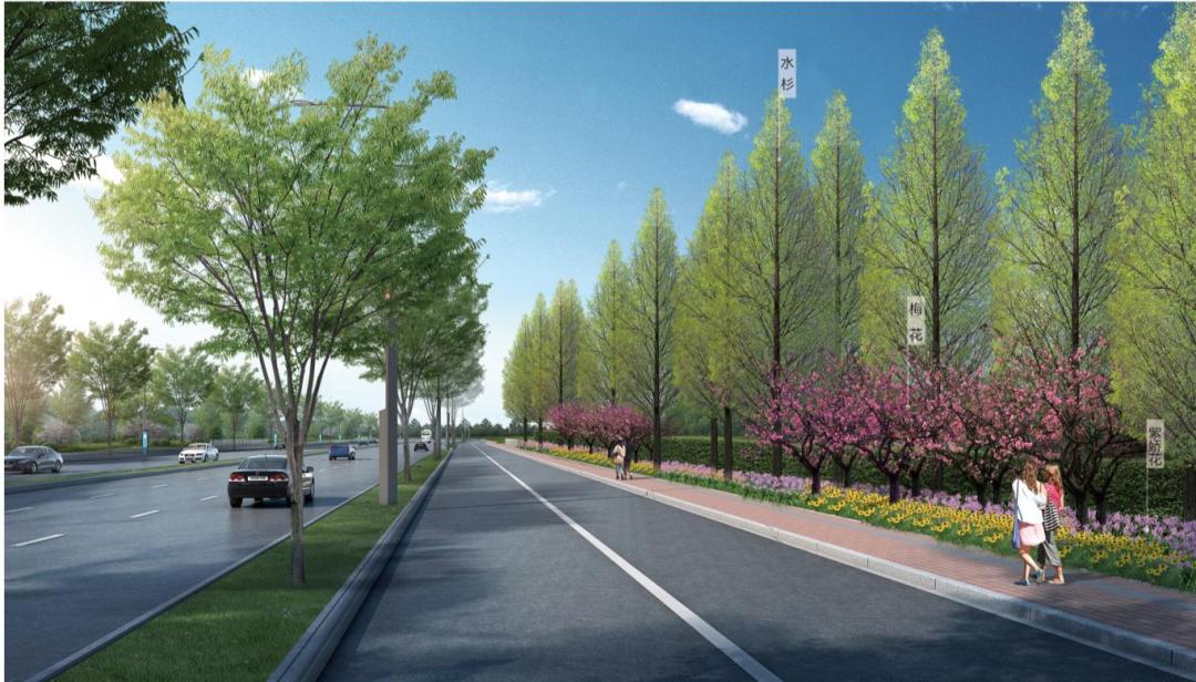 植物设计以“水杉、红梅、草花”为主基调,绿化设计注重与周边城市环境的结合,北侧利用水杉列植搭配线性草花设计,形成低养护成本的大植物空间景观。南侧通过大草坪空间的设置打造视线开放点,延续活力新城段植物设计特色,形成背景和前景相交融的植物景观。