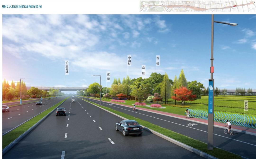生态滨海段为现代大道与滨海新区交接区段,植物设计以“中山杉、紫薇、观赏草”为主基调,以中山杉、乌桕、榔榆、紫薇等植物为主。同时考虑现代大道为城市快速路,车速较快,后退绿地的植物设计适宜采用背景林加大体量的耐碱性观花类植物,形成延续的观赏景观界面。