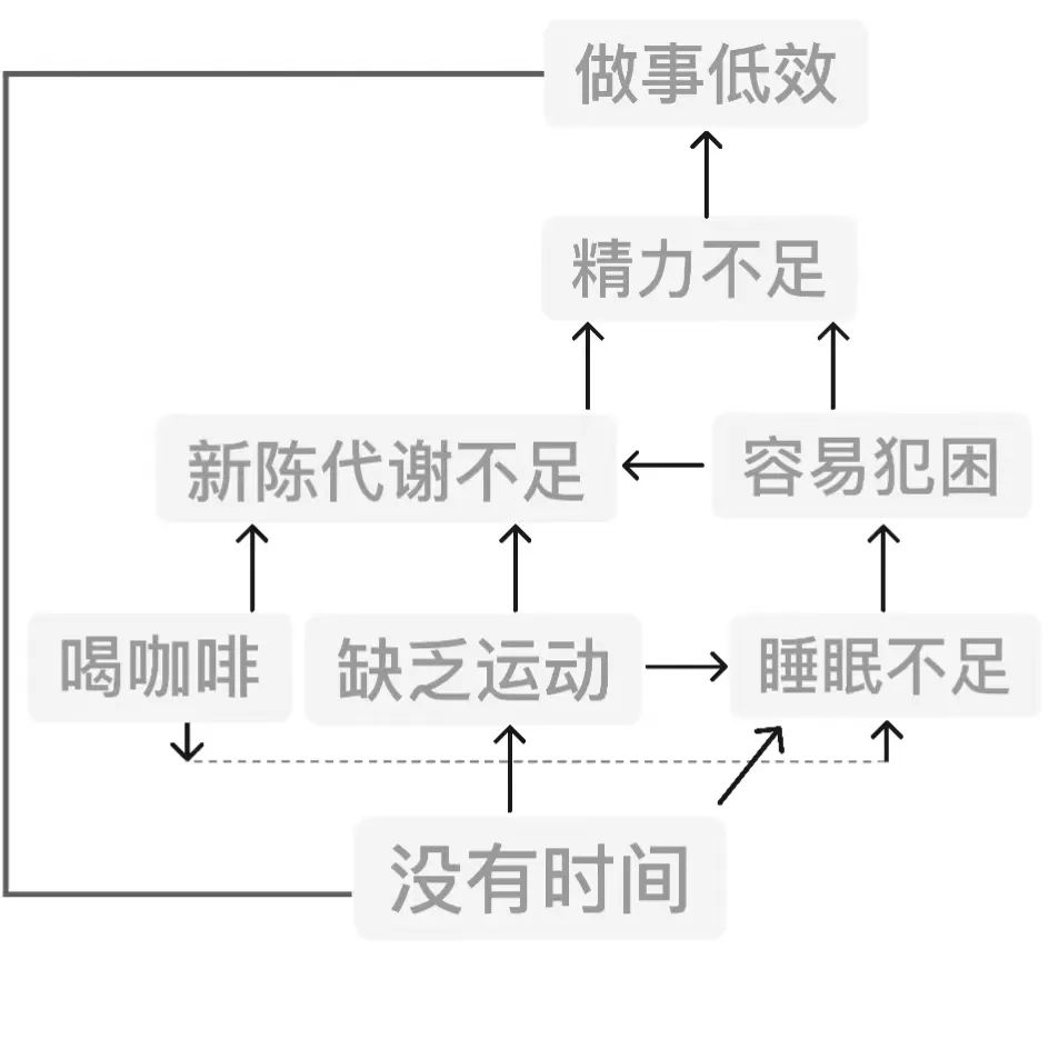 比如你做事效率低下,可能是因为精力不足,精力不足是因为睡眠不足,睡眠不足是因为时间不够,而做事效率低又导致了时间不足。