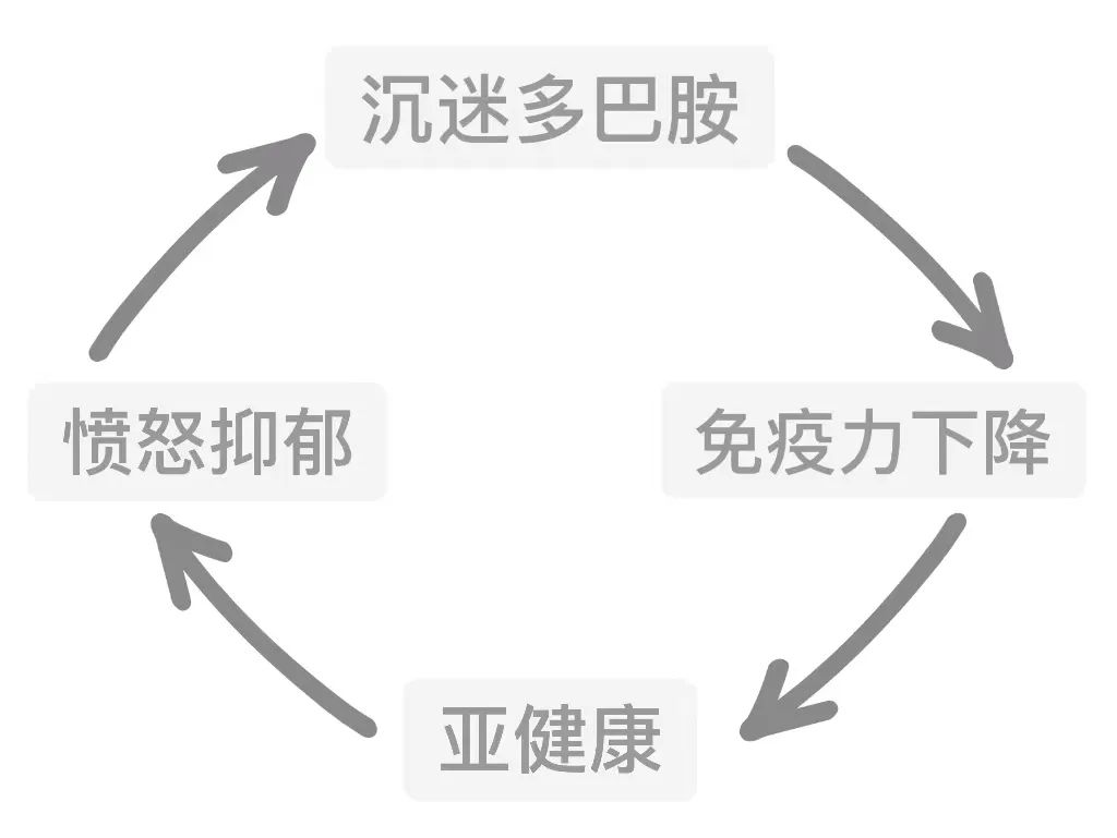 随着社会的进步发展,我们获得多巴胺型快乐的渠道越来越多,如果沉迷于此,会出现免疫力下降、身体亚健康等,从而引发不良情绪, 转而寻求更多的多巴胺刺激,对身心造成更大影响。