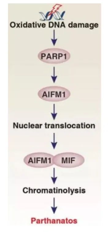 2007年,约翰霍普金斯大学医学院 Ted Dawson 与 Valina Dawson 夫妇发现了程序性脑细胞死亡的一种新形式,并将其命名为 Parthanatos,又称 PARP-1 依赖的细胞死亡。Parthanatos 死亡途径是基于 DNA 损伤和 PARP-1 激活的一种全新形式的程序性细胞坏死。简单来说,在病理状态下,细胞中大量的 DNA 损伤导致 DNA 修复酶 PARP-1 被大量激活,PARP-1 会通过代谢通路抑制有氧呼吸过程,从而促使调亡诱导因子(AIF)释放并携带巨噬细胞迁移抑制因子(PAAN/MIF)入核,使染色质凝集和 DNA 大片段化,最终导致 Parthanatos 死亡。
