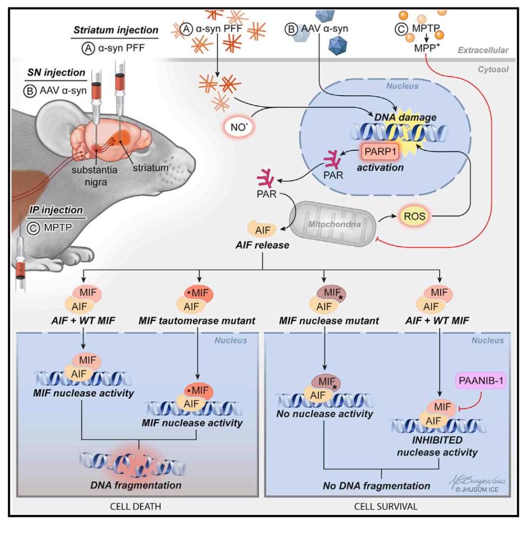 在这篇 Cell 论文中,研究团队首先证明了 Parthanatos 死亡途径中的 PAAN/MIF 核酸酶可以促使病理性α-突触核蛋白的形成。当研究人员将 PAAN/MIF 基因缺失或构建其缺乏核酸酶活性的突变体时,可以帕金森病小鼠模型的多巴胺能神经元的缺失和行为缺陷。