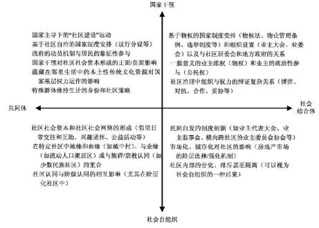 这一框架既对现实社区的复杂性和社区研究的多样化做了简化处理,又不至于因损失其主要内容和线索而缺乏分析的有效性。横坐标表示城市社区自身存在着从“共同体”到“社会”(或韦伯所说的“结合体”,下文将阐述)的连续谱,纵坐标表示影响着现实社区和社区研究的国家干预(中性意义)与社会自组织的作用,同时这两个维度也隐含着空间与时间因素。由此划分出的四个象限中分别归纳了受到相互交叉影响的社区现象/社区变迁和社区研究主题。