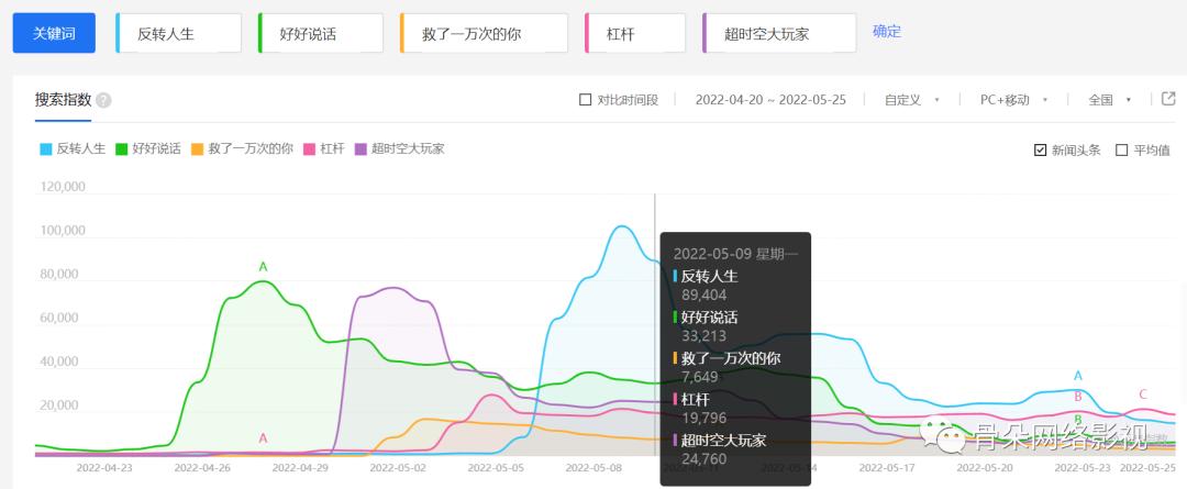 截止今晚十点,《反转人生》双平台总播放量突破6.9亿,为同期腰部剧(仅包括已公开播放量数据的网络剧)最高,抖音话题#网剧反转人生 累积播放量则达到6.5亿次,此外还有#反转人生cp互坑 #反转人生全员喜剧人 等话题播放量均破亿。对比同期播出的三部带有奇幻元素的腰部剧,从反映受众热议程度的微指数曲线来看,开播伊始《超时空大玩家》的微博讨论度较高,而自5月5日《反转人生》开播后,微指数开始反超,而后一路保持领先状态。