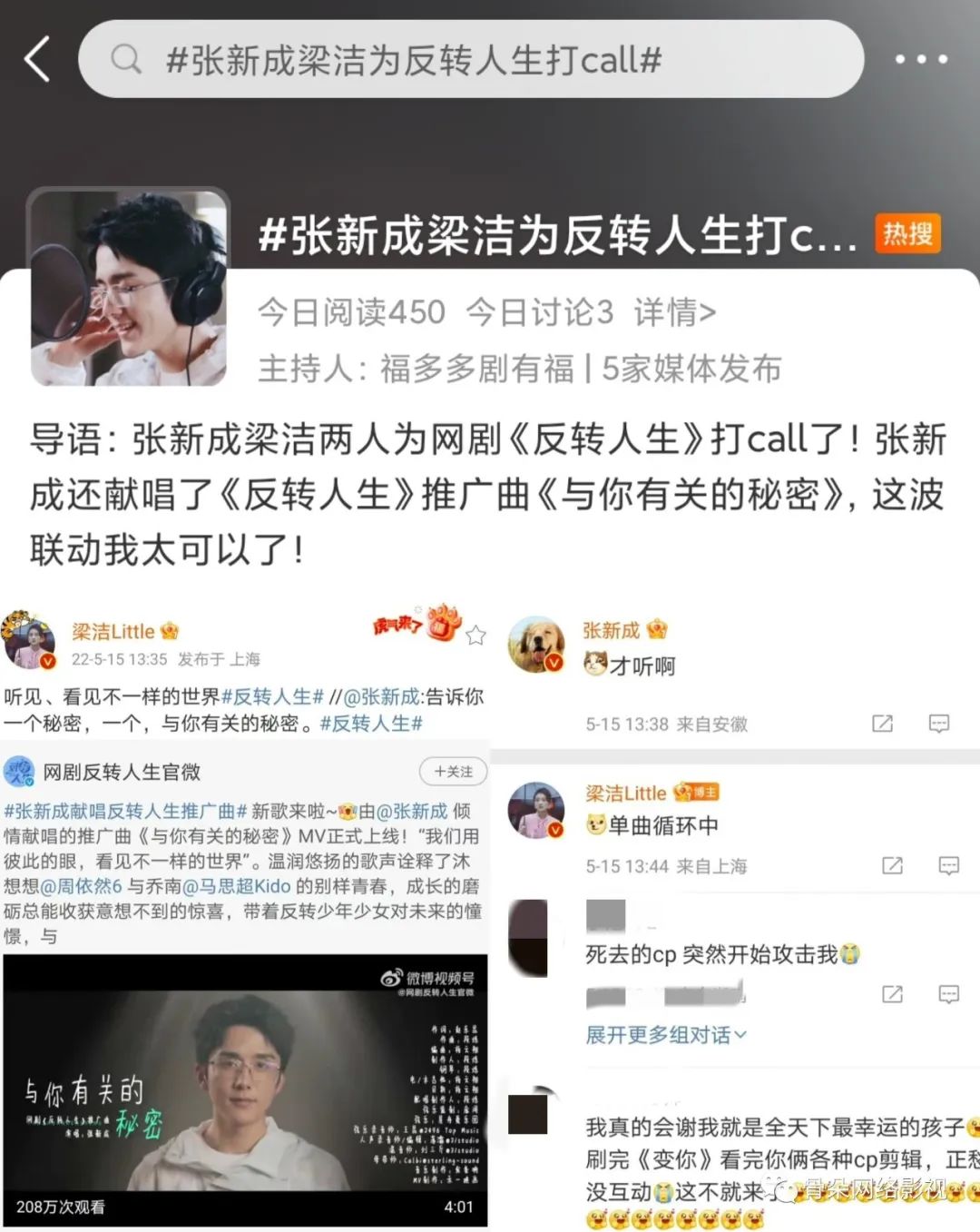 当然,酒香也怕巷子深,一部剧的成功离不开科学的营销策略。作为一部青春奇幻轻喜剧,《反转人生》并未选择炒CP、追热点等常规营销手段,而是抓住“搞笑”“男女互换”两大特点进行精准营销。一方面将剧中的搞笑名场面以魔性短视频的方式进行病毒式传播,吸引用户观剧;另一方面则联动男女互换界的“前辈”、《变成你的那一天》男主张新成演唱剧集推广曲,并吸引了女主角梁洁前来打call支持,这一手梦幻联动的效果十分显著,话题#张新成梁洁为反转人生打call#登上热搜,剧集微指也在当日再次来到峰值。