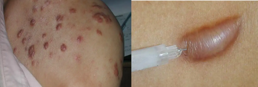 第一.针对一些体积较小(直径<2cm)或者是数量较多、较为分散的瘢痕疙瘩,首先考虑的是瘢痕的注射治疗。