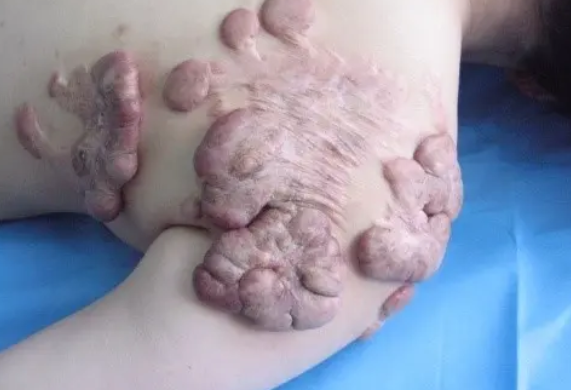 瘢痕疙瘩好发于人体的前胸、后背、下颌、肩部、会阴以及耳部,大多数表现为皮损自边缘向外周扩展、边缘不规则,形状有蟹足状、蜈蚣状、蝴蝶状或圆状,质硬,隆起表面呈瘤状,表面光滑、红润发亮的皮色、组织坚韧而有弹性,局部毛细血管微微扩张。