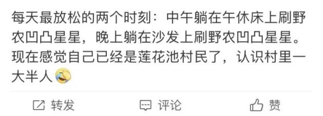 图源:微博用户「半山石」一个人吃饭就得吧唧嘴,不扯餐桌礼仪,吃出动静才香。好的钓鱼佬视频也真能咂么出好多滋味。我,还有好多人,从去年开始迷上「去种田的向凹凸」和「我是野农」的视频,这俩是表兄弟,他俩还有一个朋友「荷塘星星」也做UP主,三个人都生活在一个叫莲花池的村子里,天天贪早摸黑地打着村子溪流里的主意,严谨选钓点,气压水温溶氧率一通分析,结果最高贵的鱼获是五斤大鲤鱼,还时常空军——“空军”就是忙活一天啥也没钓着的意思。