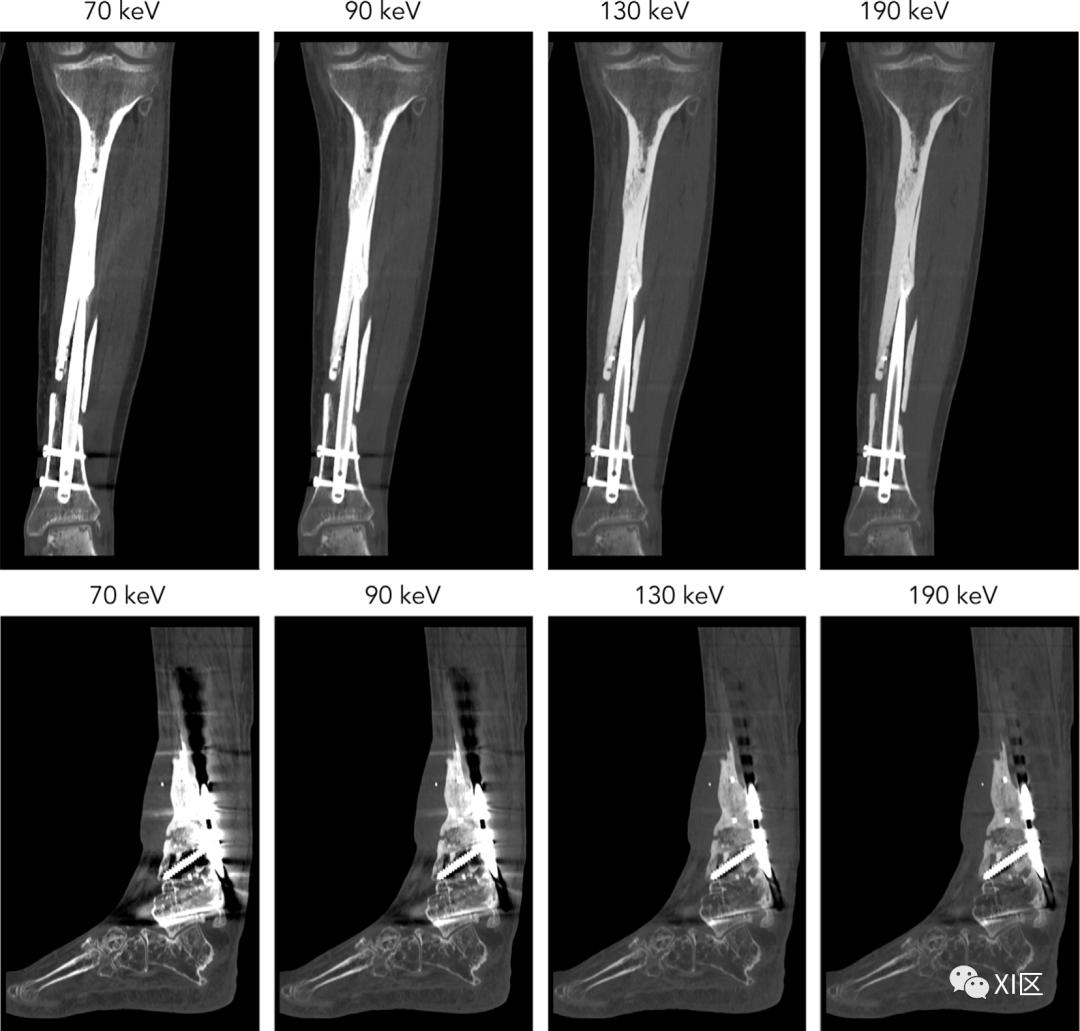 图10 显示了从左至右分别以70、90、130和190 keV提取的单色图像:放置在胫骨中的钛髓内钉(上图)和用于固定胫骨远端不愈合和胫距关节融合术的不锈钢钢板固定(下图)。髓内钛植入物的伪影较少,在较高能量下几乎没有观察到伪影减少。对于不锈钢植入物,每增加一个能量都会导致伪影减少。关于单能谱临床价值的更多内容,参见:。