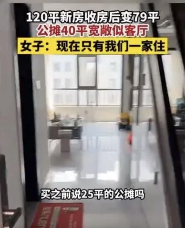 拍摄者表示,这是她买的120平方米的新房子,但套内面积只有79平方米,“公摊面积大到怀疑人生。”