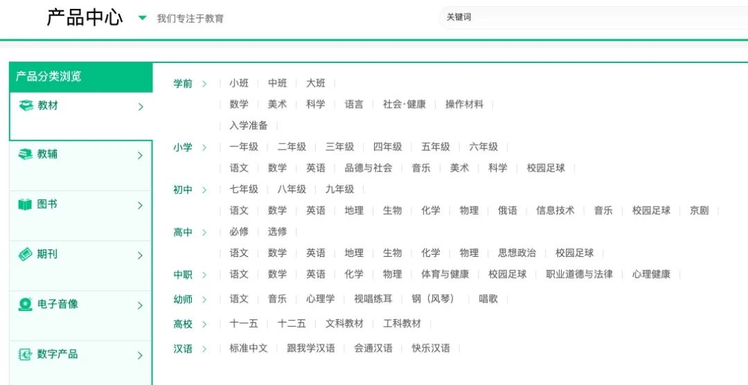 人教社领军教育出版行业的同时,其业务板块也在不断扩大。该社产品目前涵盖6大板块,分别为教材、教辅、图书、期刊、电子音像、数字产品。