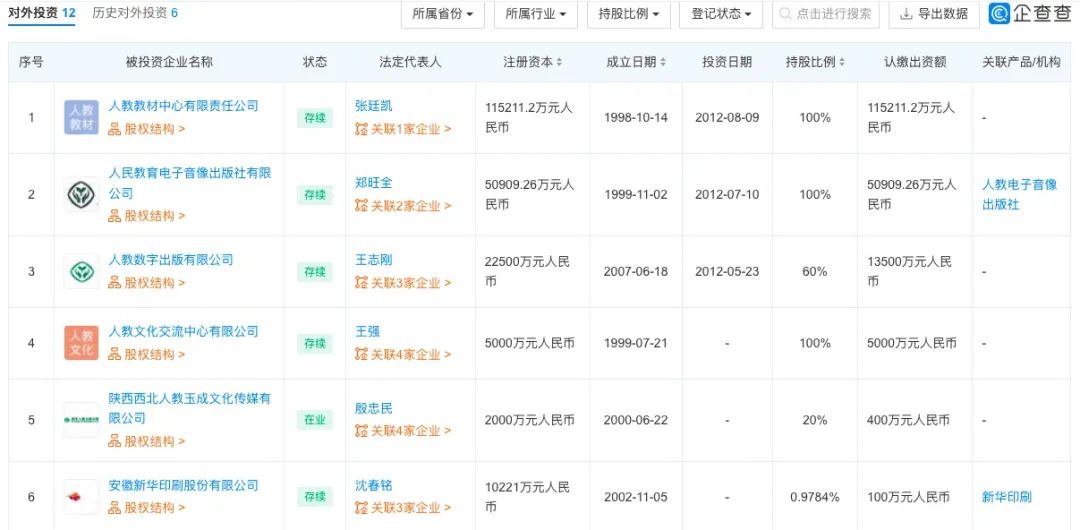 据企查查数据,人民教育出版社有限公司(曾用名:人民教育出版社)对外投资12家企业,包括6家存续、在业的企业,分别为人教教材中心有限责任公司、人民教育电子音像出版社有限公司、人教数字出版有限公司、人教文化交流中心有限公司、陕西西北人教玉成文化传媒有限公司和安徽新华印刷股份有限公司,其余6家企业已处于注销/吊销状态。