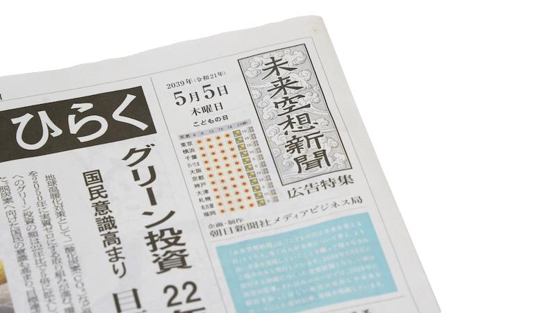 来自多个国家的25位设计师参与这次品牌宣告今年五月开始,「Make New」在日本各大电视台、线上媒体、铁路、广告墙等大力宣告,首期就联动朝日新闻,发行了一份来自2039年的幻想未来报纸──「未来空想新闻」特刊。