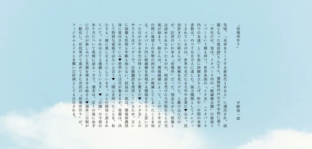 内容上,报纸所有的文章主题都是“未来”,主要谈论的是未来在生活方式、家庭、性别、教育、AI 等各方面会有什么样的成长与变化,以此为契机让更多人开始思考并实现想要的未来。