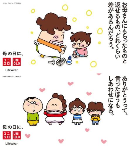 四格漫画呈现的广告,并非刊登在同一面报纸版面上,而是得逐页翻阅,也正是这样才能体会到报纸广告堆叠的力量和趣味。5月8日母亲节当天,优衣库还追加了两则漫画表达祝福,「妈妈给我的,我能还多少?一定有差别吧。」「说谢谢的人也会感到幸福」,再次鼓励大家记得对妈妈表达爱意和感谢。