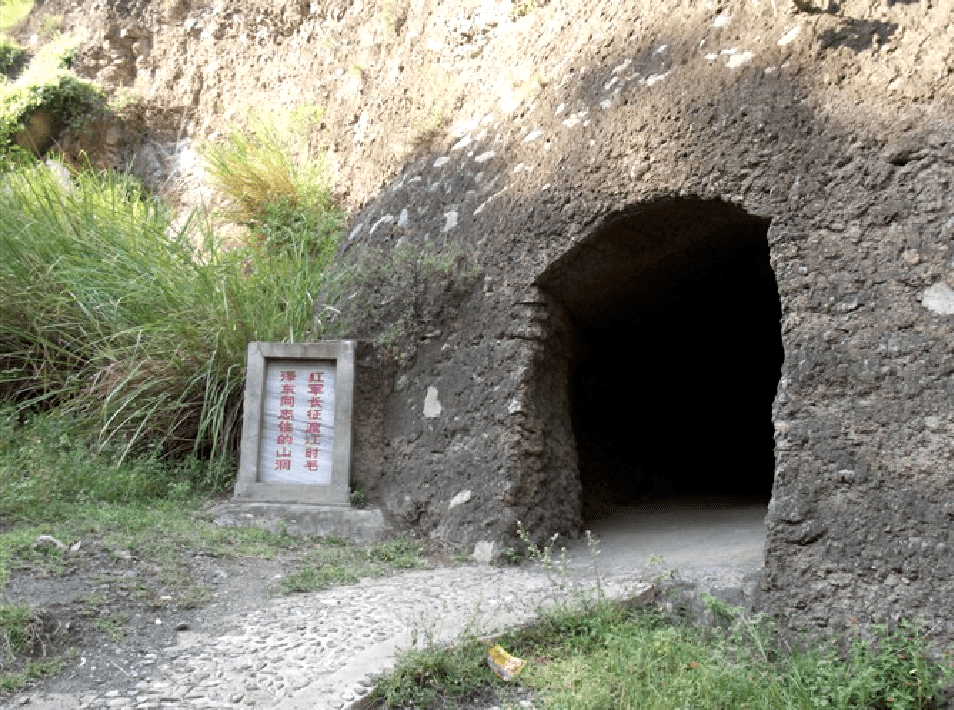 船缓缓地停靠在江的北岸。北岸的四川一侧没有云南那面的金色沙滩,沿江悬崖内凿有一条近百米长的孔道,船停靠在孔道口,沿孔口石级而上,在一处很高的石坡上面,有11个历代船工打出的砂石洞,洞内空空如也,什么东西也没有。毛泽东和总部人员便被安排在此住,他日夜不停地工作,亲自组织和指挥整个红军部队的渡江行动。