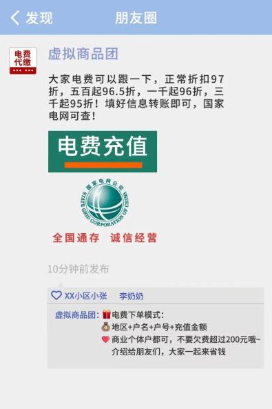 前些日子,李女士在小区楼下看到贴的“交纳电费有优惠”的广告,想省点钱的李女士就加上了微信。刚开始李女士还有点怀疑,但看到上面有国家电网的图片,于是就放下了戒备心理。看到优惠活动“存1000送1200”,“存电费打折”,李女士头脑一热就点击了支付,等待返钱,谁知骗子早已将其拉黑跑路了。