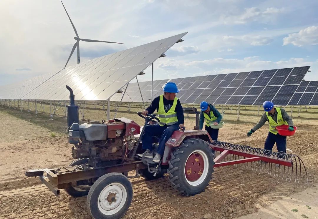 拖拉机先犁地、松土,作业人员再撒草籽,洒水车浇水,拖拉机盖土,5月的光伏区一派繁忙的“种草”场面。“土一般得盖到草籽上方的1.5厘米左右,太厚不好发芽,太薄草籽又容易被风吹走。为了保证成活率,我们一般都得种两遍。”正在现场协调的施工项目部工程部部长陈昊介绍说。