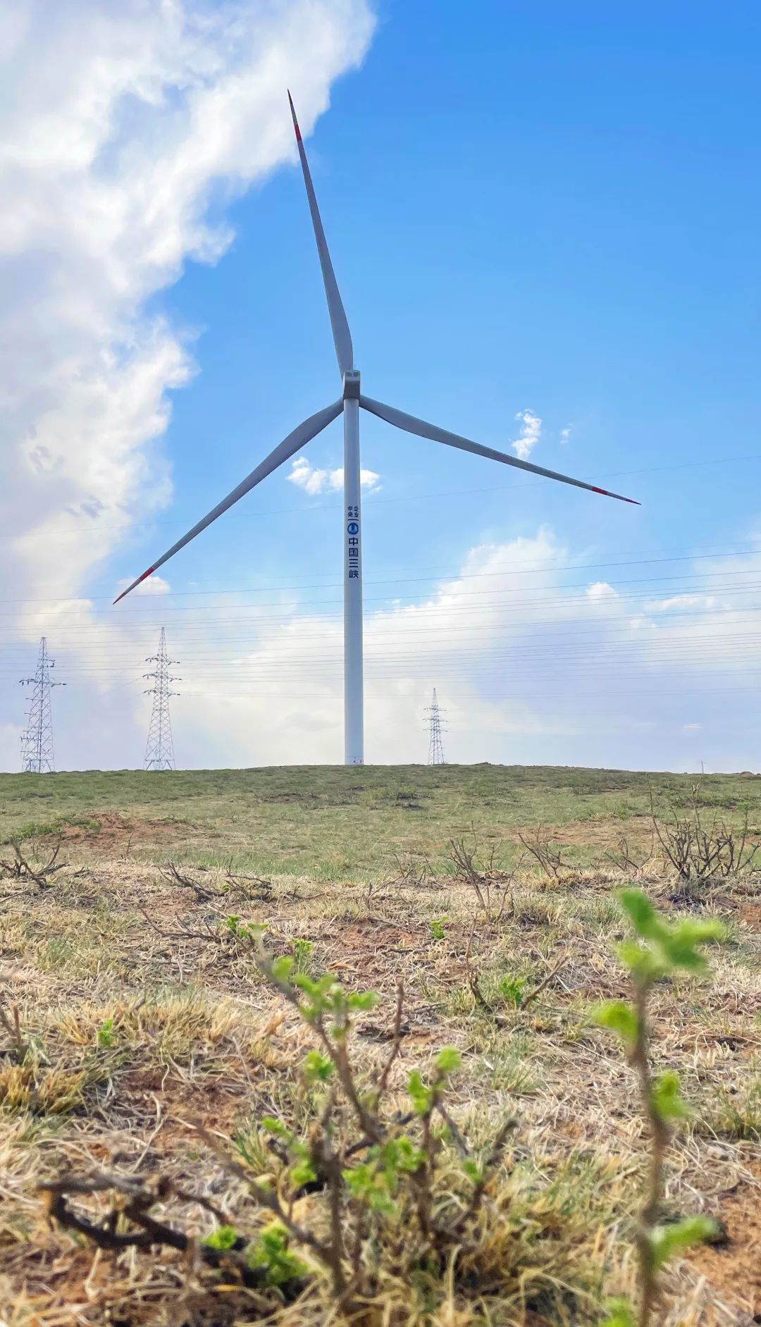 “除了光伏区,风力发电机基座周围和风场临时施工道路,也要陆续复种。”施工项目部现场经理王欣说。今年4月,刚种下的主要是草苜蓿、批碱草、羊草、杂草等这些耐寒耐旱的草种,光伏板下已经长出了好长一截,偶尔还能发现野生的沙葱。