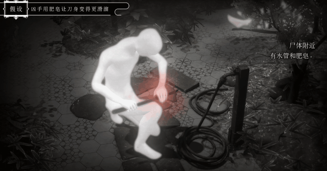 完成推理后,为了方便玩家想象作案过程,游戏会用动画形式,还原假设的整个犯罪过程。假设:凶手用肥皂让刀身变得更滑溜 ▼