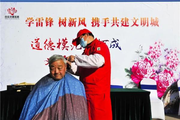 任丘市道德模范彭栓成给市民义务理发。河北日报通讯员 陈子康摄2019年10月,任丘市被确定为建设新时代文明实践中心全国试点县(市)。目前,任丘市建成1所新时代文明实践中心、20个乡(镇、街道办)新时代文明实践所、402个村(社区)新时代文明实践站,覆盖率达100%。