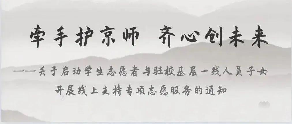 应广大学子的呼声,校团委5月19日启动“牵手护京师 齐心创未来”学生志愿者与驻校基层一线人员子女线上支持专项志愿服务项目,以线上方式为基层一线人员子女提供学业辅导、生涯指导、心理关怀、艺术普及、运动带练、绘本讲读、生活资讯等服务。