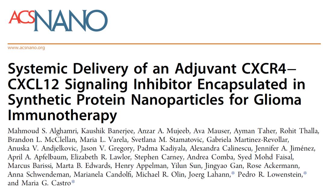 2022年5月26日,密歇根大学医学院神经外科 Maria G. Castro 教授和 Pedro R. Lowenstein 教授等人在 ACS NANO 期刊发表了题为:Systemic Delivery of an Adjuvant CXCR4–CXCL12 Signaling Inhibitor Encapsulated in Synthetic Protein Nanoparticles for Glioma Immunotherapy 的研究论文。