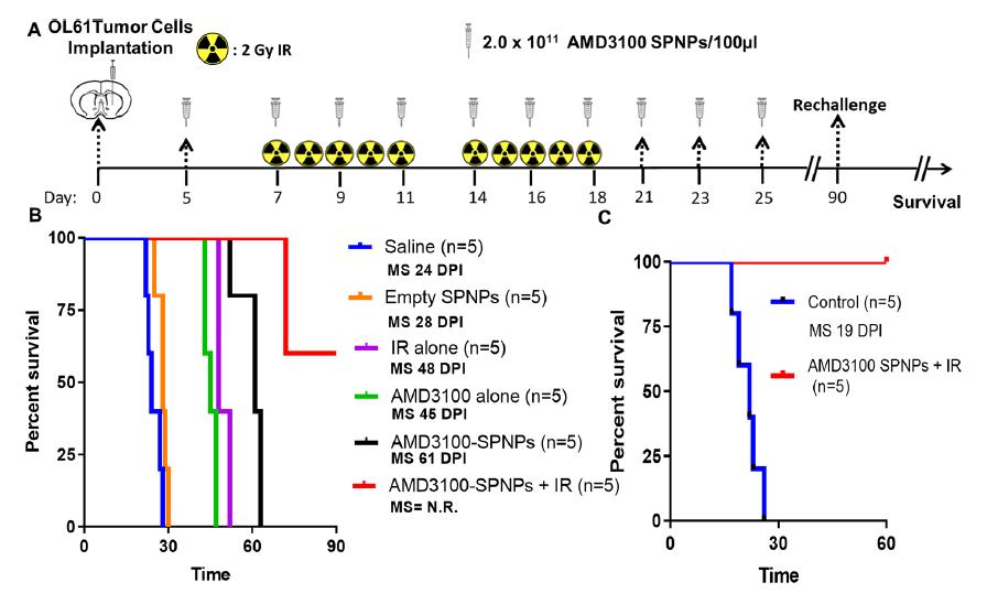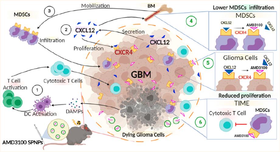 该研究开发了一种生物相容性纳米颗粒,能够突破血脑屏障,向胶质母细胞瘤成功递送 CXCR4抑制剂,从而激活免疫系统对抗脑肿瘤。此外,该过程还触发了免疫记忆,能够清除重新引入的脑肿瘤。这表明该方法不仅可以治疗脑肿瘤,还可以预防或延缓复发。